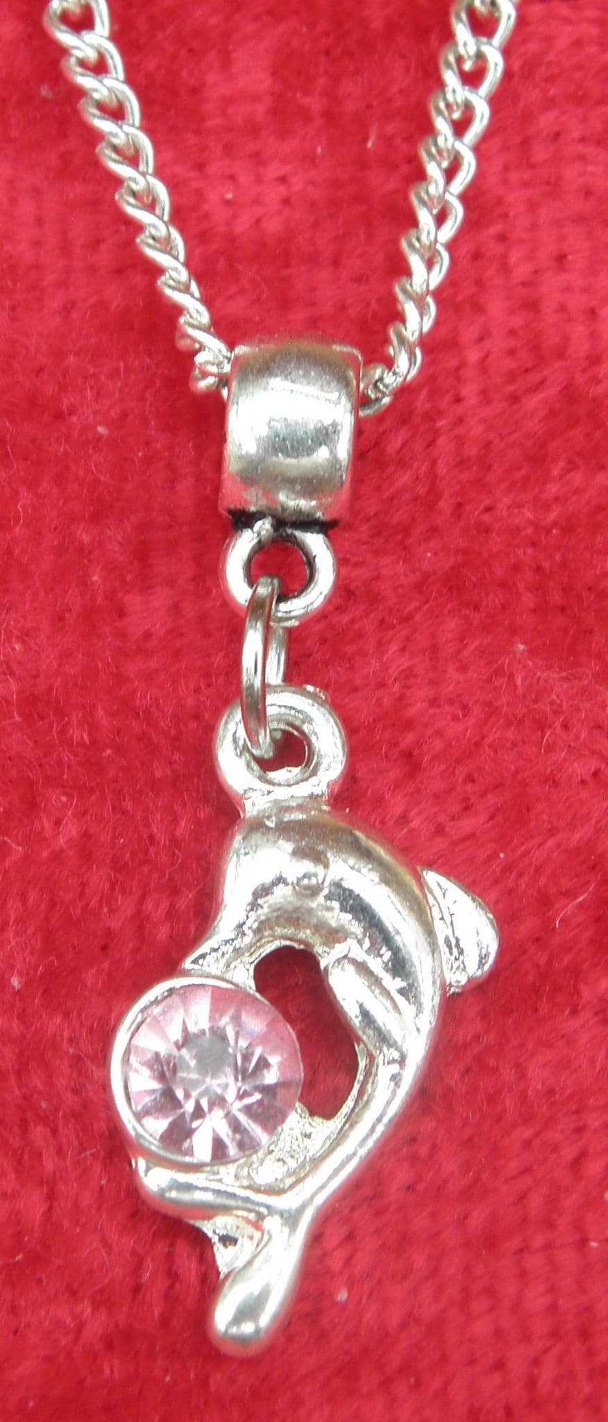 Pink dolphin comes attached to a Silver-tone necklace measuring approx size: 2mm x 3mm chain links & either 18" or 24" long (select your option for chain length).