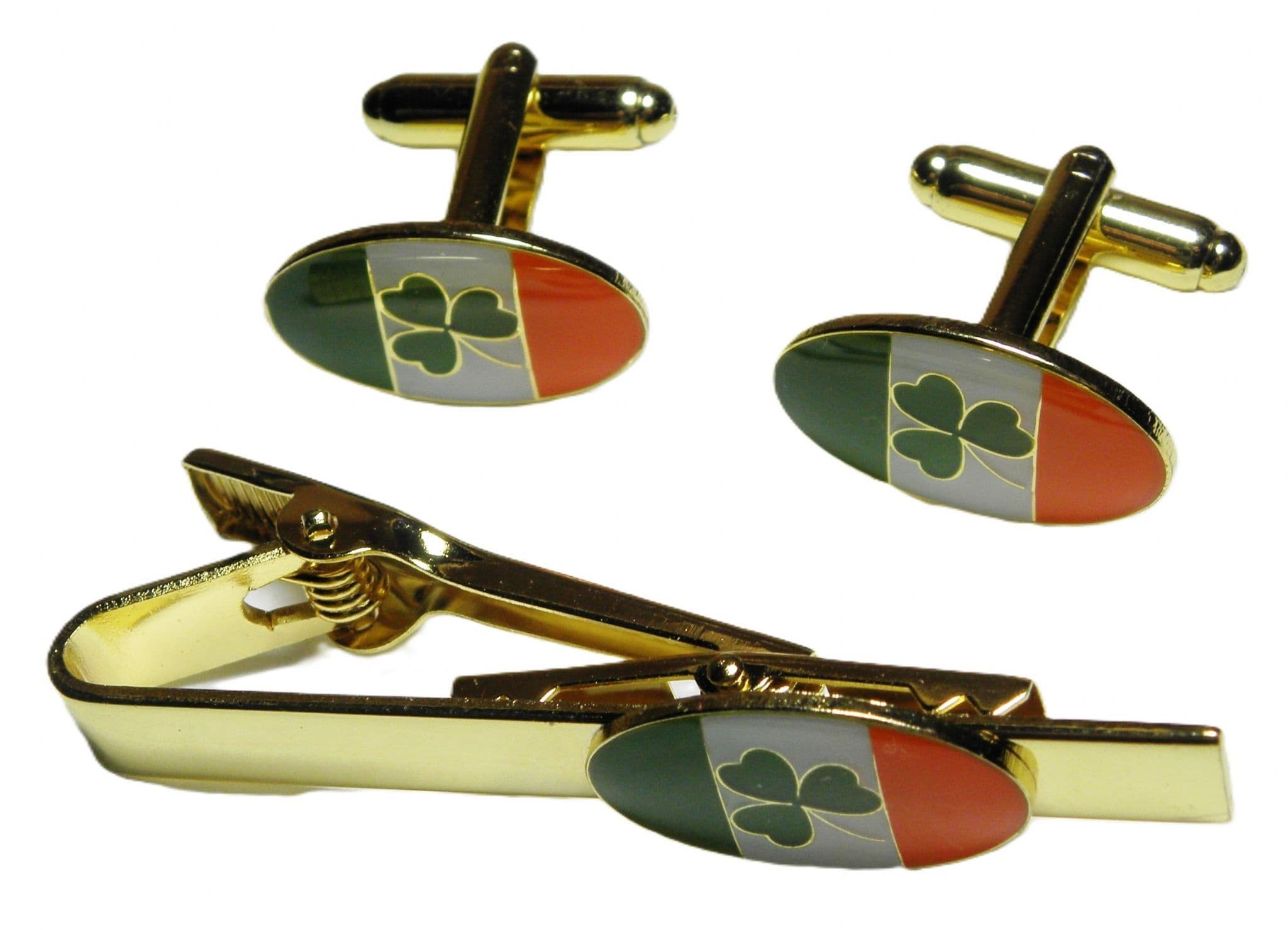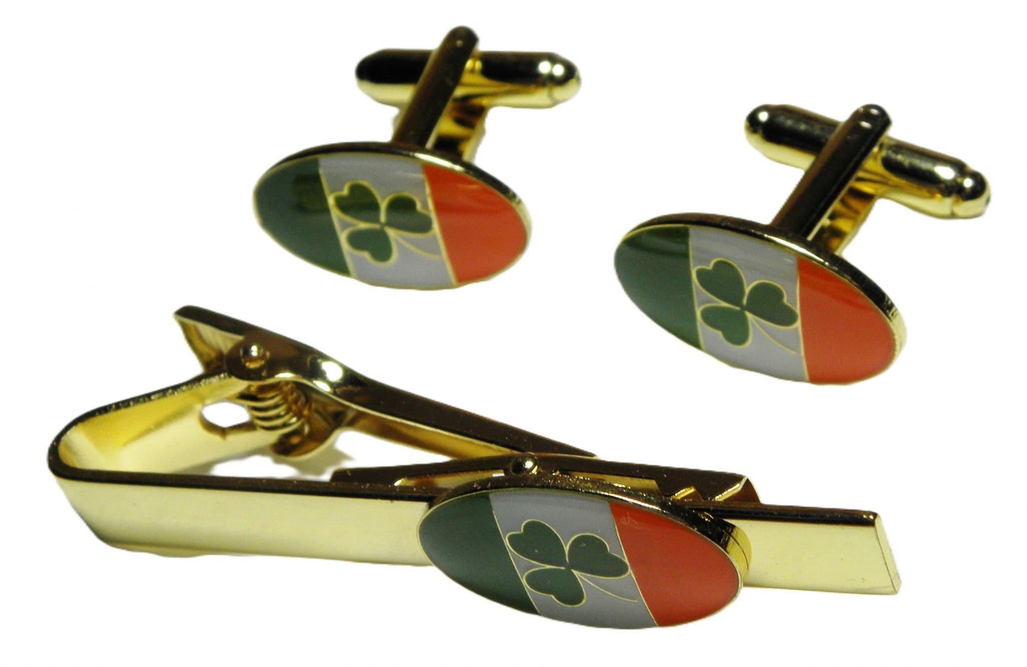 IRELAND FLAG & SHAMROCK TIE BAR & CUFFLINKS SET AS ILLUSTRATED.