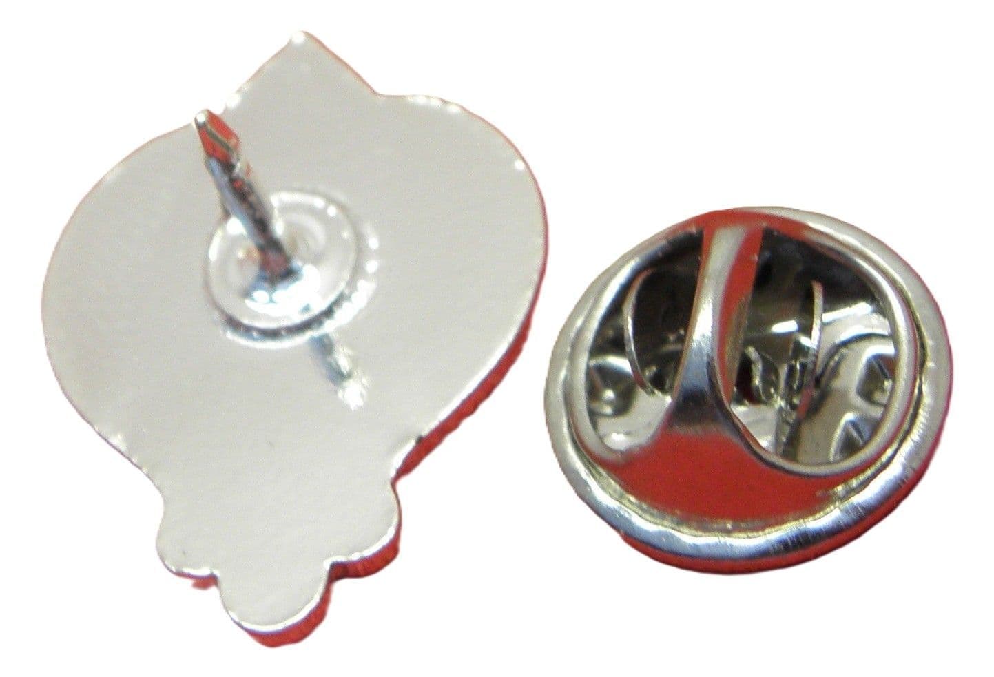 Pin badge comes with a metal squeeze clamp to hold it in place at the back.